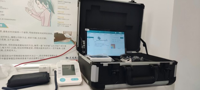 除了SH-T17智能健康一體機(jī),健康中心也配置了SH-202便攜式健康一體機(jī),SH-202便攜式健康體檢一體機(jī)是上禾針對(duì)基層公衛(wèi)推出的一款便攜式公共衛(wèi)生檢測(cè)設(shè)備,可以通過平板電腦等數(shù)據(jù)采集終端和數(shù)據(jù)管理軟件系統(tǒng)實(shí)現(xiàn)一體化整合,實(shí)現(xiàn)心電圖、心率、血糖、血壓、血氧飽和度、尿常規(guī)、體溫等多種參數(shù)檢測(cè),快速建立居民電子健康檔案,與信息管理平臺(tái)或健康檔案管理系統(tǒng)進(jìn)行數(shù)據(jù)交互傳輸,可上傳或成批次/單獨(dú)下載調(diào)用數(shù)據(jù),并提供接口開發(fā)包,支持將采集到的健康數(shù)據(jù)上傳至區(qū)域信息平臺(tái)或健康檔案管理系統(tǒng)。
