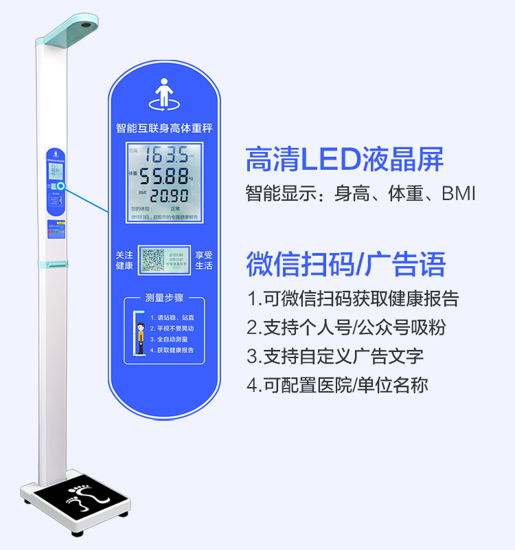 上禾SH-201智能雙屏身高體重測量儀,適合90%以上的春季體檢使用場景,雙屏顯示、可折疊、可設置您的專屬宣傳語、全自動測量、語音播報、數據傳輸等,您想要的功能,它都有!